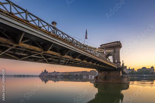 Obraz premium Budapest, Hungary - Beautiful golden sunrise at Szechenyi Chain Bridge with...