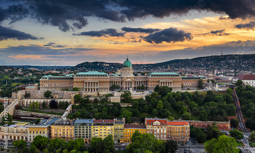 Fototapeta premium Budapest, Hungary - Dramatic golden sunset over Buda Castle Royal Palace at summer time taken with a drone