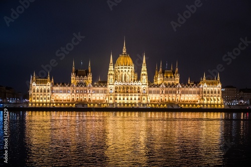 © Istak15, Fototapeta premium Budapest, Hungary - January 22 2023: The Hungarian Parliament Building (Országház) illuminated at night, reflected in the Danube.