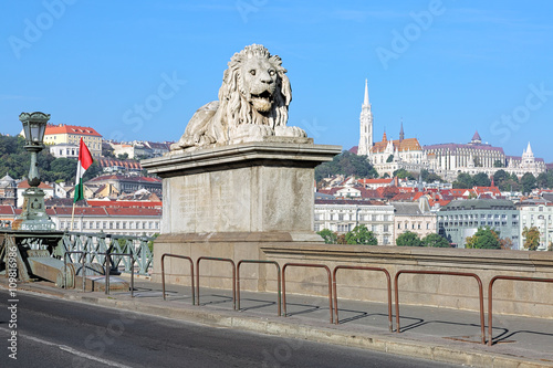 Obraz premium Budapest, Hungary. Stone lion on the Szechenyi Chain Bridge on the background of Castle Hill with Matthias Church and Fisherman's Bastion.
