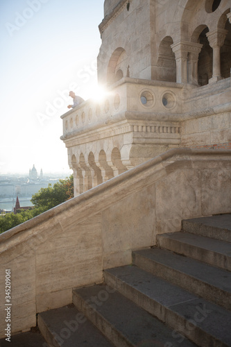Fototapeta premium Budapest, Hungary - The famous Fisherman's Bastion at sunrise with statue of...