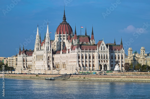 © Mikhail Markovskiy, Fototapeta premium Budapest, Hungary. The Hungarian Parliament Building on the bank of the Danube, and fragment of the building of Ethnographic Museum, former Royal Palace of Justice.