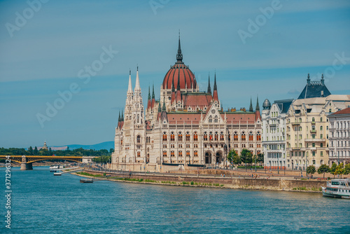 Obraz premium Budapest, Hungary. View on Parliament building over delta of Danube river..