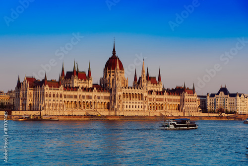 Fototapeta premium Budapest Parliament building and Danube river at sunset, travel Hungary...