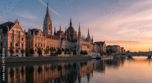 © asik, Obraz premium Budapest Parliament Building at Sunset Reflecting in the Danube River