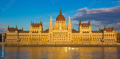 Fototapeta premium Budapest Parliament Building illuminated before sunset, Hungary