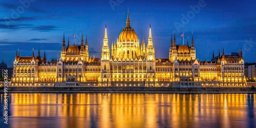© Latsamee, Obraz premium Budapest, Parliament Building, splendor, reflected, illuminated, Nighttime Splendor Orszaghaz Parliament Building Illuminated in Budapest Reflected