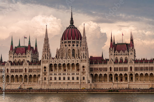 © pellephoto, Fototapeta premium Budapest Parliament cloudy sunset landscape from Danube river