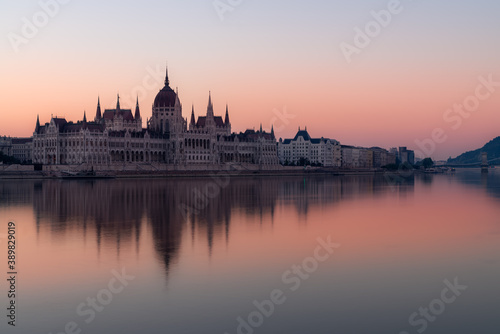 Obraz premium Budapest parliament on the Danube banks at dusk, Hungary