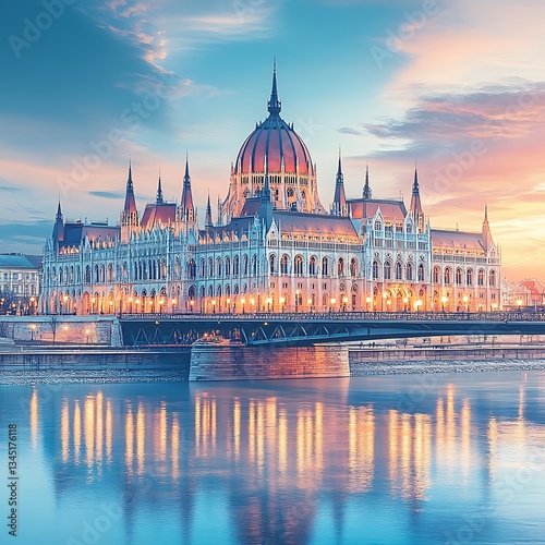 © Cinto, Fototapeta premium Budapest Parliament Sunrise Reflection.