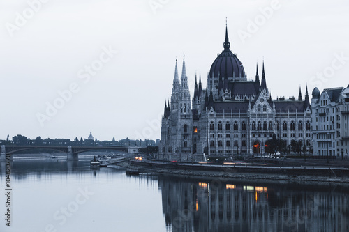 © Nickolay Khoroshkov, Obraz premium Budapest skyline at dark