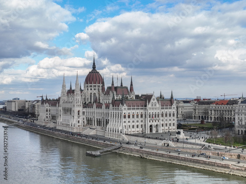 © Mindaugas Dulinskas, Fototapeta premium Budapest Skyline Hungarian Parliament Building and Danube River from a Drone Point of View