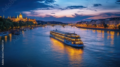 Naklejka premium Budapest Twilight Danube River Cruise, Parliament Building, Cityscape