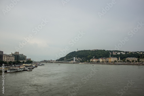 © Artem Kniaz, Naklejka premium Budapest waterfront in gray rainy day time with river and ships