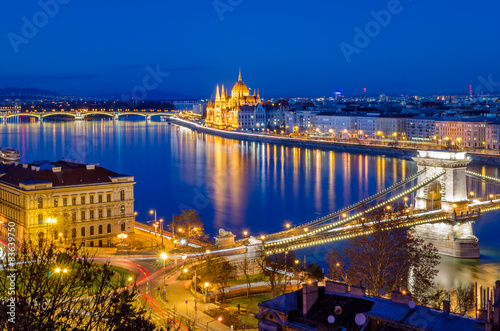 © Marco Saracco, Naklejka premium Budapeszt, węgierski parlament i Dunaj o niebieskiej godzinie