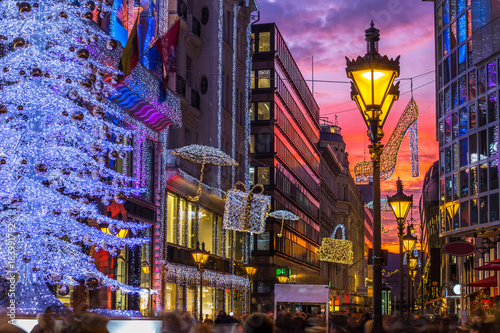 © zgphotography, Fototapeta premium Budapeszt, Węgry - Świecąca choinka i turyści na ruchliwej ulicy Vaci, słynnej ulicy handlowej Budapesztu w czasie świąt Bożego Narodzenia ze sklepami i pięknym niebem o zachodzie słońca
