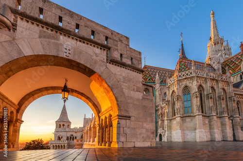 Fototapeta premium Budapeszt, Węgry - wejście do dzielnicy Buda z pięknym kościołem Macieja o złotym wschodzie słońca i jasnym, błękitnym niebem