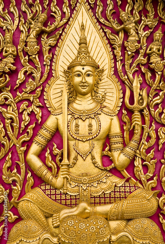 © wuttichok, Fototapeta premium Buddha carved gold paint on church door