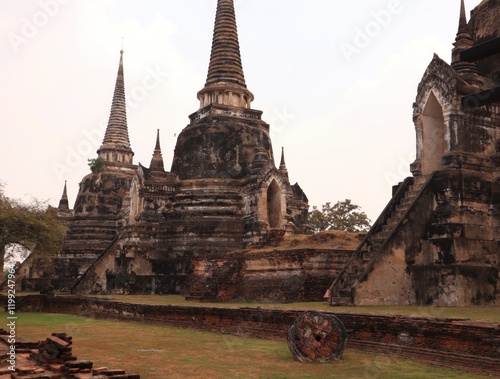 © Auxjiz, Fototapeta premium Buddha,fine arts,thailand Ancient temple ruins with tall spires and historical architecture.