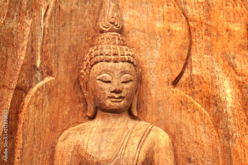 © Amphawan, Fototapeta premium Buddha image carving on wooden brown crafts background