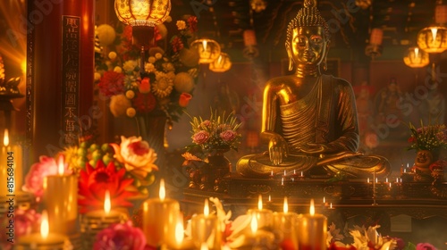 © Vasili, Fototapeta premium Buddha statue. Golden Enlightenment: Within the hallowed halls of a grand temple, a gilded Buddha statue stands as a beacon of spiritual enlightenment and divine grace.