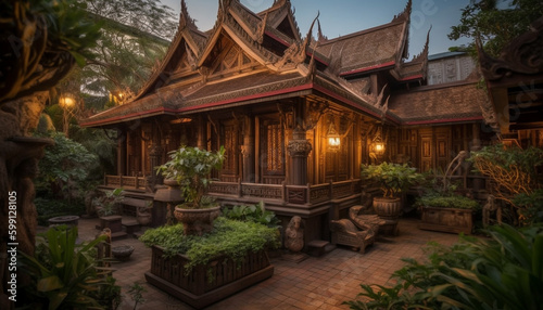 Naklejka premium Buddhist pagoda, ancient and spiritual, in tropical Bali generated by AI