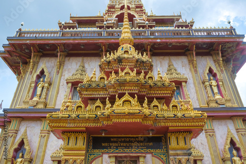 © evelinphoto, Naklejka premium Buddhist temple with Buddha statues on a green background.