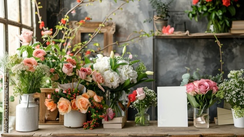 © ASoullife, Fototapeta premium Budding Business Floral Designer's Studio with Fresh Cut Flowers and Blank Business Cards