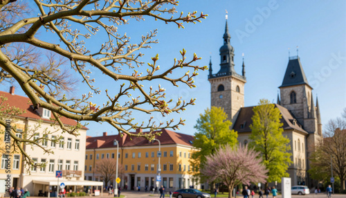 © Anna K@S, Obraz premium Budding linden tree branches in town square, spring awakening