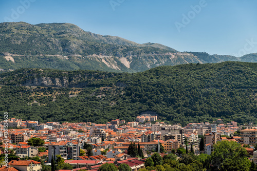 Fototapeta premium Budva Montenegro cityscape skyline view on canyon mountains, high angle aerial landscape by roof rooftops of residential buildings in summer