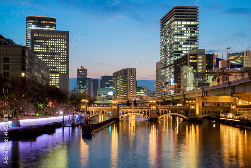© ake1150, Fototapeta premium Budynek drapacza chmur w Osace w dzielnicy Nakanoshima w nocy w Osace w Japonii