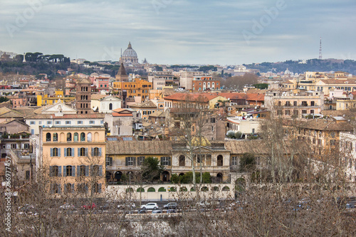© Daniil, Obraz premium Budynki mieszkalne i fasady, architektura włoska, widok z tarasu widokowego na domy z oknami z okiennicami, ulicami, jezdnią. Widok z góry w parku w Rzymie, Włochy.