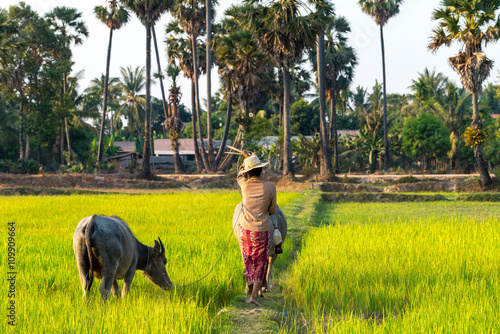 Naklejka premium Buffalo in Rice field Siem Reap, Cambodia Apr 2016