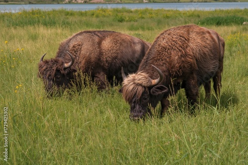 © TheWaterMeloonProjec, Fototapeta premium Buffalo relax while feeding