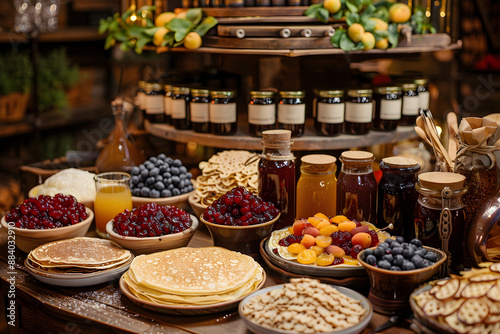 Fototapeta premium Buffet, avec crêpes et pots de confiture