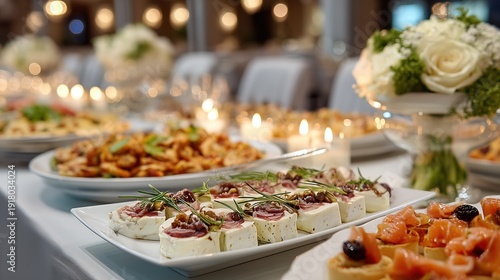 Obraz premium Buffet élégant avec canapés au saumon et fromage sur table festive