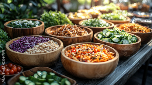 © Your Hand Please, Fototapeta premium Buffet setup with diverse dishes symbolizing abundance and variety in food hospitality minimalistic bright light tone modern blurred empty blank caption space on the side
