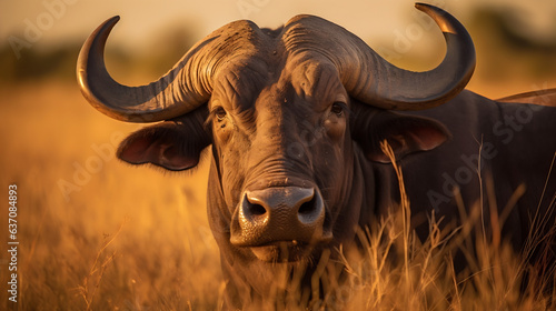 Naklejka premium Buffle africain, face à la caméra, hyper-détaillé, en haute définition