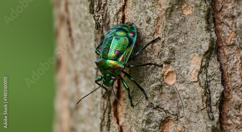 Fototapeta premium Bug Climbing on Tree Bark with Iridescent Green Coloring