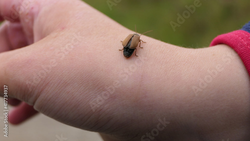 © peter, Obraz premium Bug insect sitting on a hand in the countryside