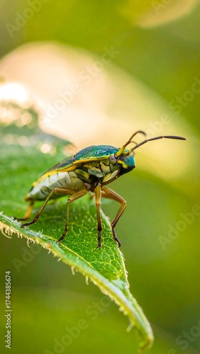 Fototapeta premium Bug on a green leaf with nature's backdrop