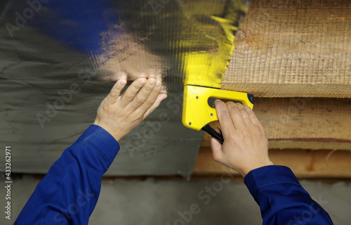 © Alekss, Fototapeta premium Builder attaches vapor barrier membrane