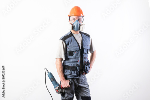 Naklejka premium Builder in a helmet and a respirator, with an angle grinder in his hands.