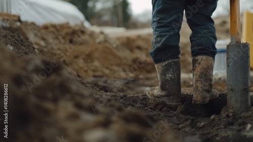 Fototapeta premium Builder inspecting a foundation at a construction site. Featuring focus and...