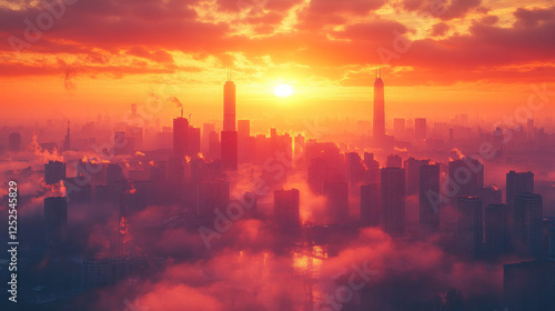 © Wararat, Fototapeta premium Building background with city silhouettes at sunrise, creating a tranquil and inspiring scene
