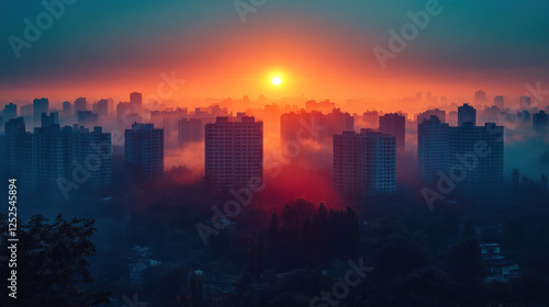 © Wararat, Fototapeta premium Building background with city silhouettes at sunrise, creating a tranquil and inspiring scene