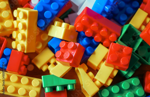 © NARONG, Naklejka premium Building block toy with colorful blocks bricks toy, close up
