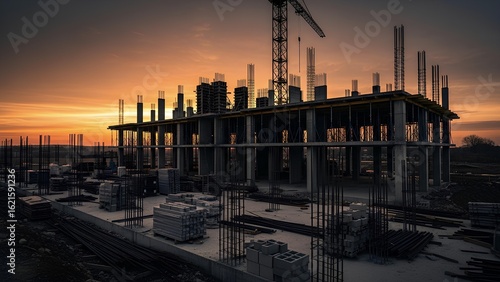 Obraz premium Building construction site with steel rebar and crane at sunset