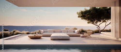 © MOMO, Fototapeta premium Building Exterior luxury of living room with sea view by generative AI illustration.