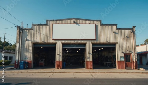 Obraz premium Building facade featuring a blank white sign under a red sign with the word
